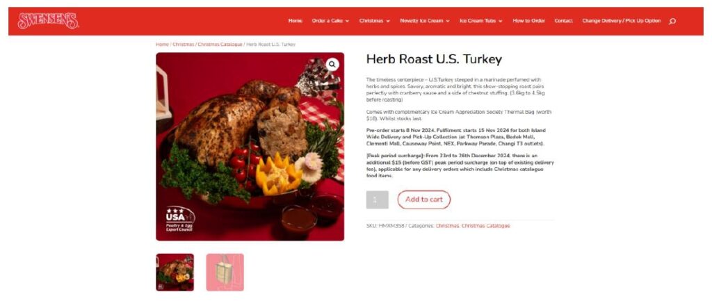 Images and the availability of the Herb Roast U.S. Turkey were showcased prominently across Swensen’s owned media, including its physical stores, website, eStore, digital catalog, social media accounts, and newsletter. Printed copies of Swensen’s Christmas catalog featuring the Herb Roast U.S. Turkey were displayed and distributed at its outlets to diners as well as to consumers who ordered delivery.