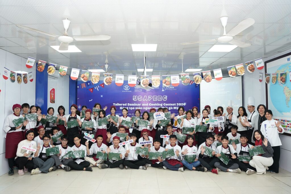 The USAPEEC Tailored Seminar and Cooking Contest took place on January 6, 2026, at the Hanoi Hospitality and Tourism College. The event began with a training session on cold chain management and food hygiene, before Iron Chef Le Xuan Tam showcased four U.S. chicken recipes in a live cooking demonstration attended by 50 culinary students. Following the seminar, 10 student teams competed in a 45-minute cooking challenge, each presenting a dish highlighting U.S. chicken.